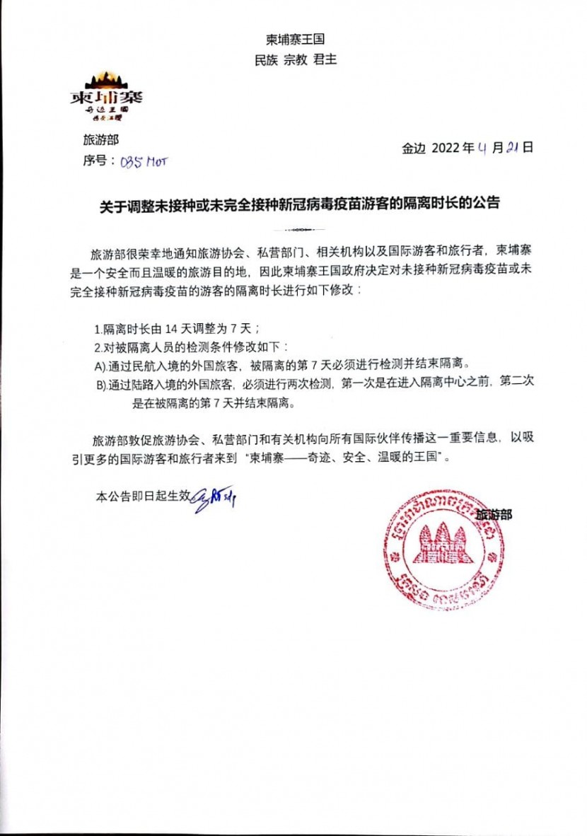 សេចក្តីជូនដំណឹងលេខ១៥៥ សជណ.អអទ ចុះថ្ងៃទី២១ ខែមេសា ឆ្នាំ២០២២ របស់ក្រសួងទេសចរណ៍ ស្តីពីការកែសម្រួលលក្ខខណ្ឌនៃការធ្វើចត្តាឡីស័ក សម្រាប់អ្នកដំណើរបរទេស ដែលមិនទាន់បានចាក់វ៉ាក់សាំងបង្ការជំងឺកូវីដ-១៩ ចូលមកកម្ពុជា