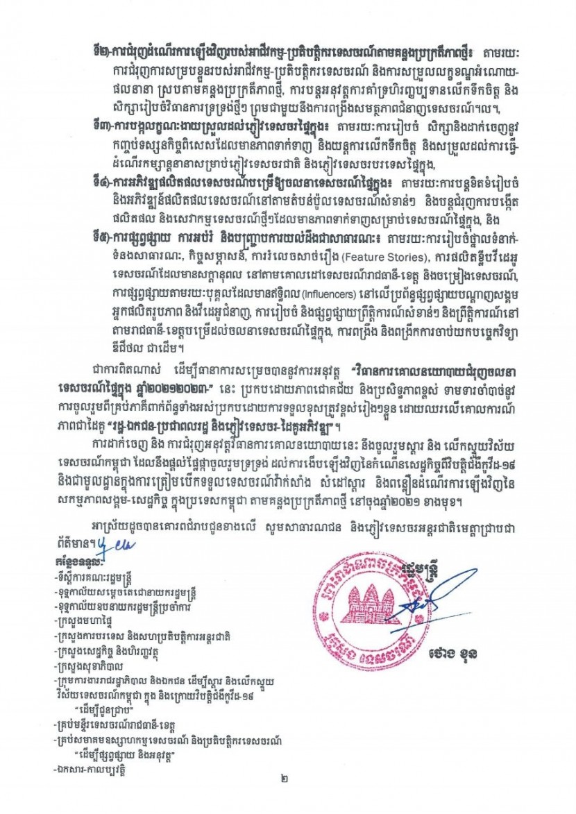 សេចក្តីជូនដំណឹងលេខ ៤២០ សជណ.អគឧ ចុះថ្ងៃទី២៦ ខែតុលា ឆ្នាំ២០២១ របស់ក្រសួងទេសចរណ៍ ស្តីពី វិធានការគោលនយោបាយជំរុញចលនាទេសចរណ៍ផ្ទៃក្នុង ឆ្នាំ២០២១-២០២៣