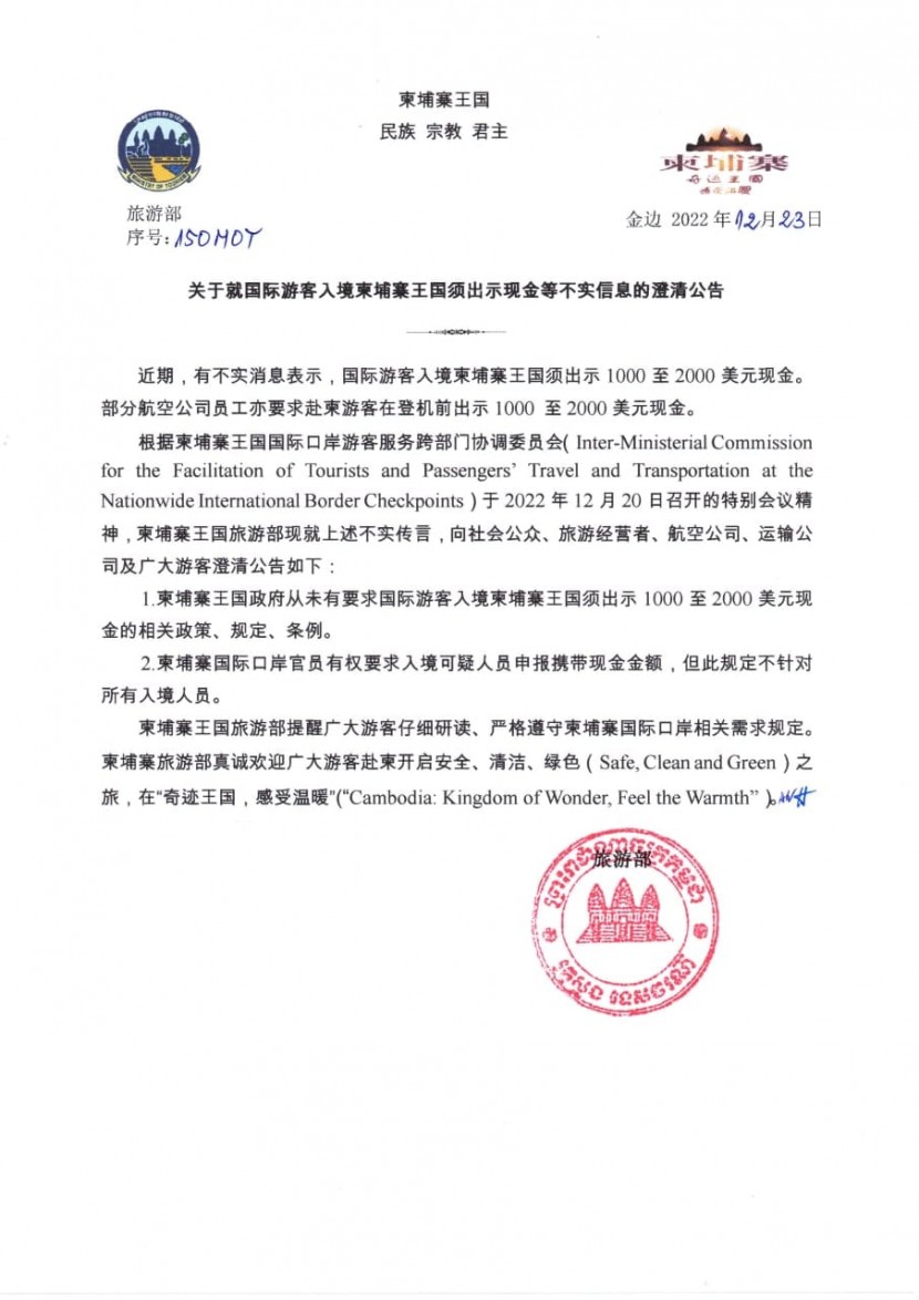 សេចក្តីជូនដំណឹងលេខ ៤៩៣ សជណ ចុះថ្ងៃទី២២ ខែធ្នូ ឆ្នាំ២០២២ របស់ក្រសួងទេសចរណ៍ ស្តីពី ព័ត៌មាននៃការសាកសួរភ្ញៀវទេសចរអំពីចំនួនទឹកប្រាក់យកតាមខ្លួនមុនចូលមកព្រះរាជាណាចក្រកម្ពុជា