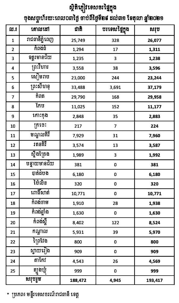ក្នុងចំណោមភ្ញៀវទេសចរសរុបទាំងនោះមានភ្ញៀវជាតិ ១៨៨,៤៧២ នាក់ និងភ្ញៀវបរទេសផ្ទៃក្នុង ៤,៩៤៥ នាក់។ ចំនួនភ្ញៀវទេសចរបរទេសផ្ទៃក្នុងនៅចុងសប្ដាហ៍ទី៤នៃខែតុលានេះ គឺមានការកើនឡើងគួរឱ្យកត់សម្គាល់។