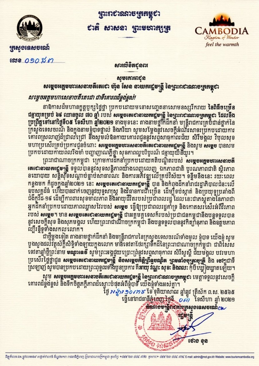 សារលិខិតជូនពរលេខ ០១០ ជព ចុះថ្ងៃទី០៣ ខែសីហា ឆ្នាំ២០២១ របស់ក្រសួងទេសចរណ៍ សូមគោរពជូន សម្តេចអគ្គមហាសេនាបតីតេជោ ហ៊ុន សែន នាយករដ្ឋមន្ត្រី នៃព្រះរាជាណាចក្រកម្ពុជា ក្នុងឱកាសដ៏មហានក្ខត្តឫក្សថ្លៃថ្លា ប្រកបដោយមនោសញ្ចេតនាសោមនស្សរីករាយ នៃពិធីចម្រើនជន្មាយុគម្រប់៦៩ ឈានចូល៧០ឆ្នាំ របស់សម្តេចអគ្គមហាសេនាបតីតេជោ ហ៊ុន សែន នាយករដ្ឋមន្ត្រី នៃព្រះរាជាណាចក្រកម្ពុជា