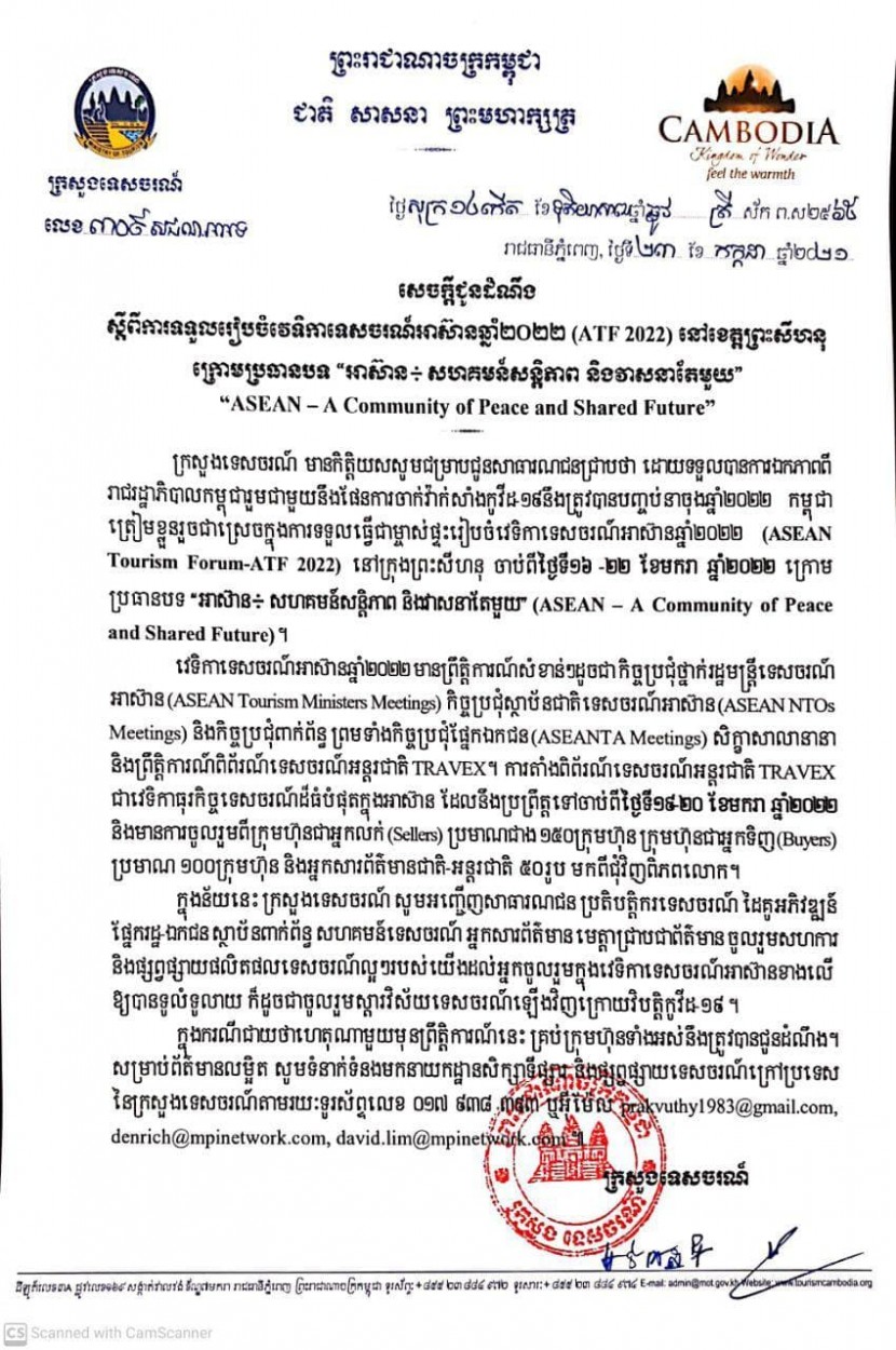 ក្រសួងទេសចរណ៍ មានកិត្តិយសជូមជំរាបជូនដំណឹងដល់សាធារណជន ស្តីពីការទទួលរៀបចំវេទិការទេសចរណ៍អាស៊ានឆ្នាំ ២០២២(ATF 2022) នៅខេត្តព្រះសីហនុក្រោមប្រធានបទ អាស៊ាន៖ សហគមន៍សន្តិភាព និងវាសនាតែមួយ