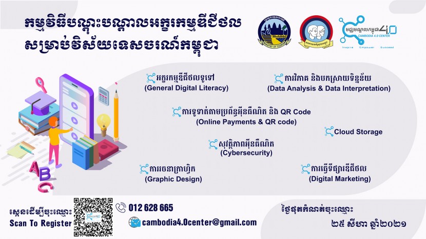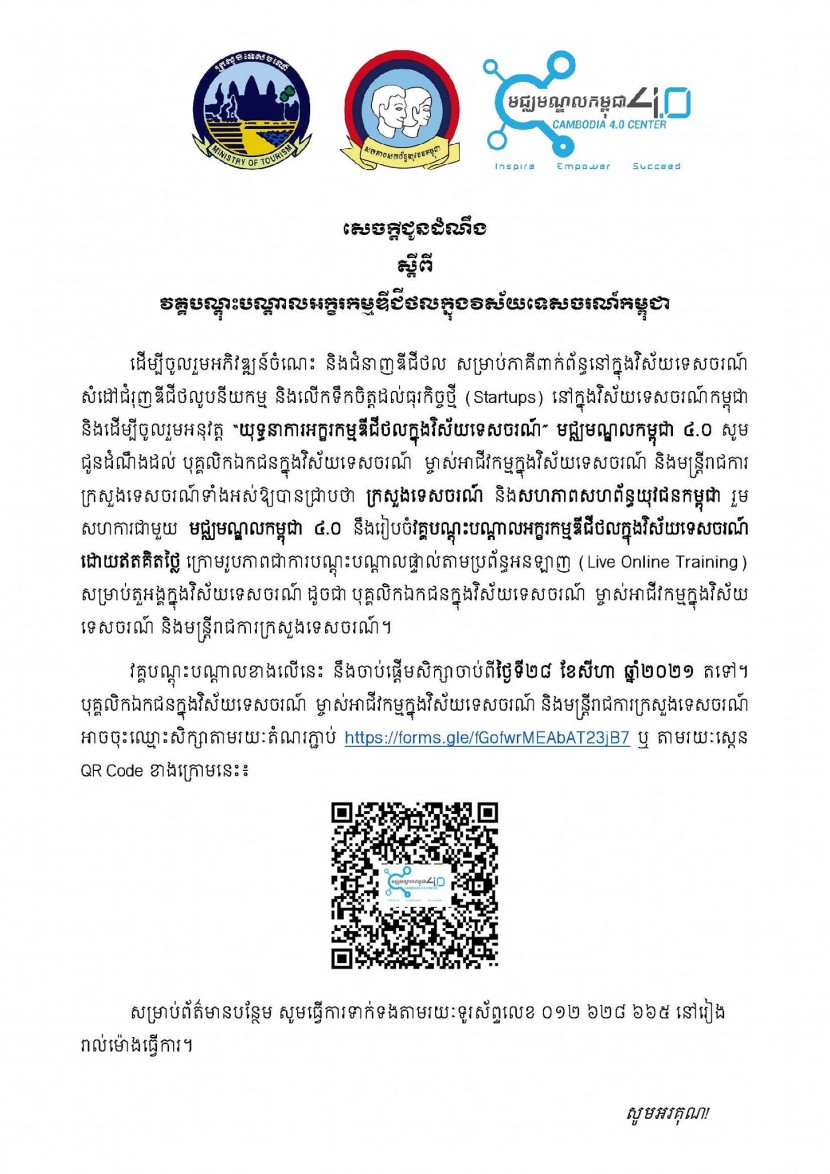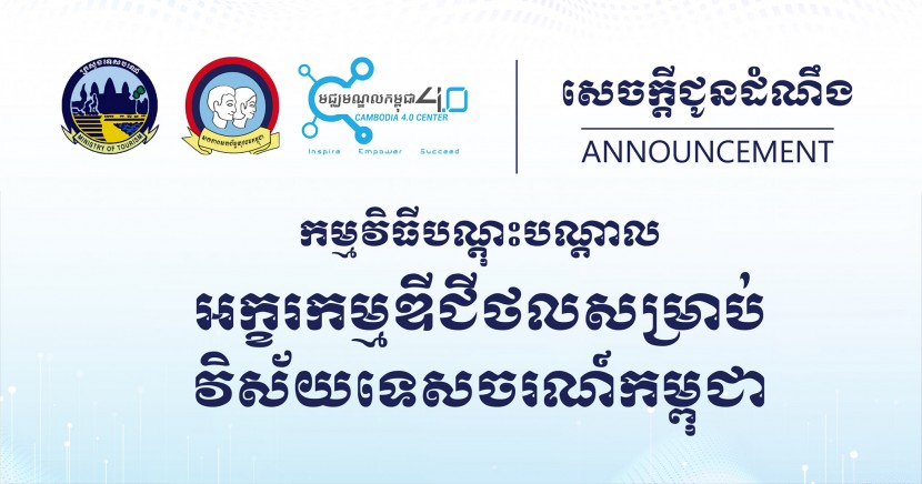 សេចក្តីជូនដំណឹងអំពីការរៀបចំ «វគ្គបណ្តុះបណ្តាលអក្ខរកម្មឌីជីថលក្នុងវិស័យទេសចរណ៍កម្ពុជា» ក្រោមកិច្ចសហការរវាងក្រសួងទេសចរណ៍ សហភាពសហព័ន្ធយុវជនកម្ពុជា និងមជ្ឈមណ្ឌលកម្ពុជា ៤.០ ដើម្បីចូលរួមអភិវឌ្ឍន៍ចំណេះ និងជំនាញឌីជីថលសម្រាប់មន្ត្រីរាជការ បុគ្គលិកទូទៅ និងម្ចាស់អាជីវកម្មនៅក្នុងវិស័យទេសចរណ៍ សំដៅជំរុញឌីជីថលូបនីយកម្មនៅក្នុងវិស័យទេសចរណ៍កម្ពុជា។