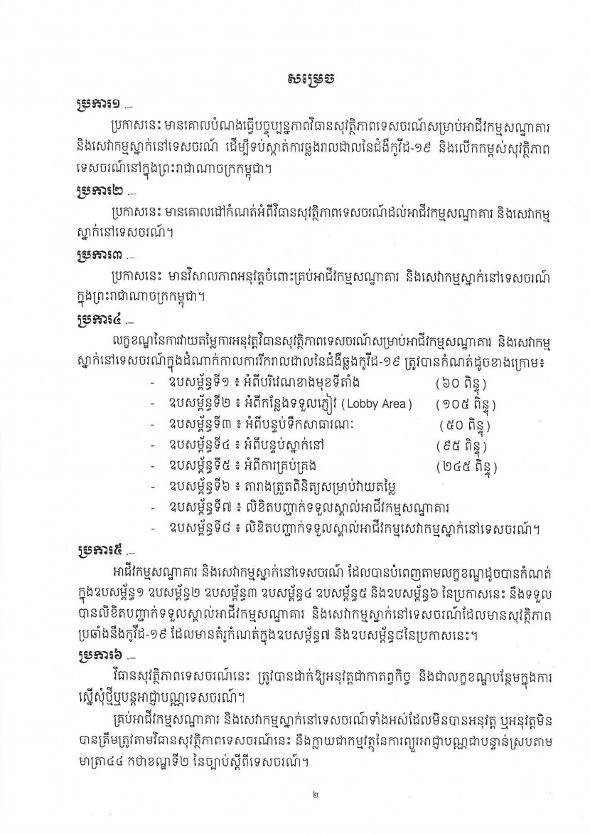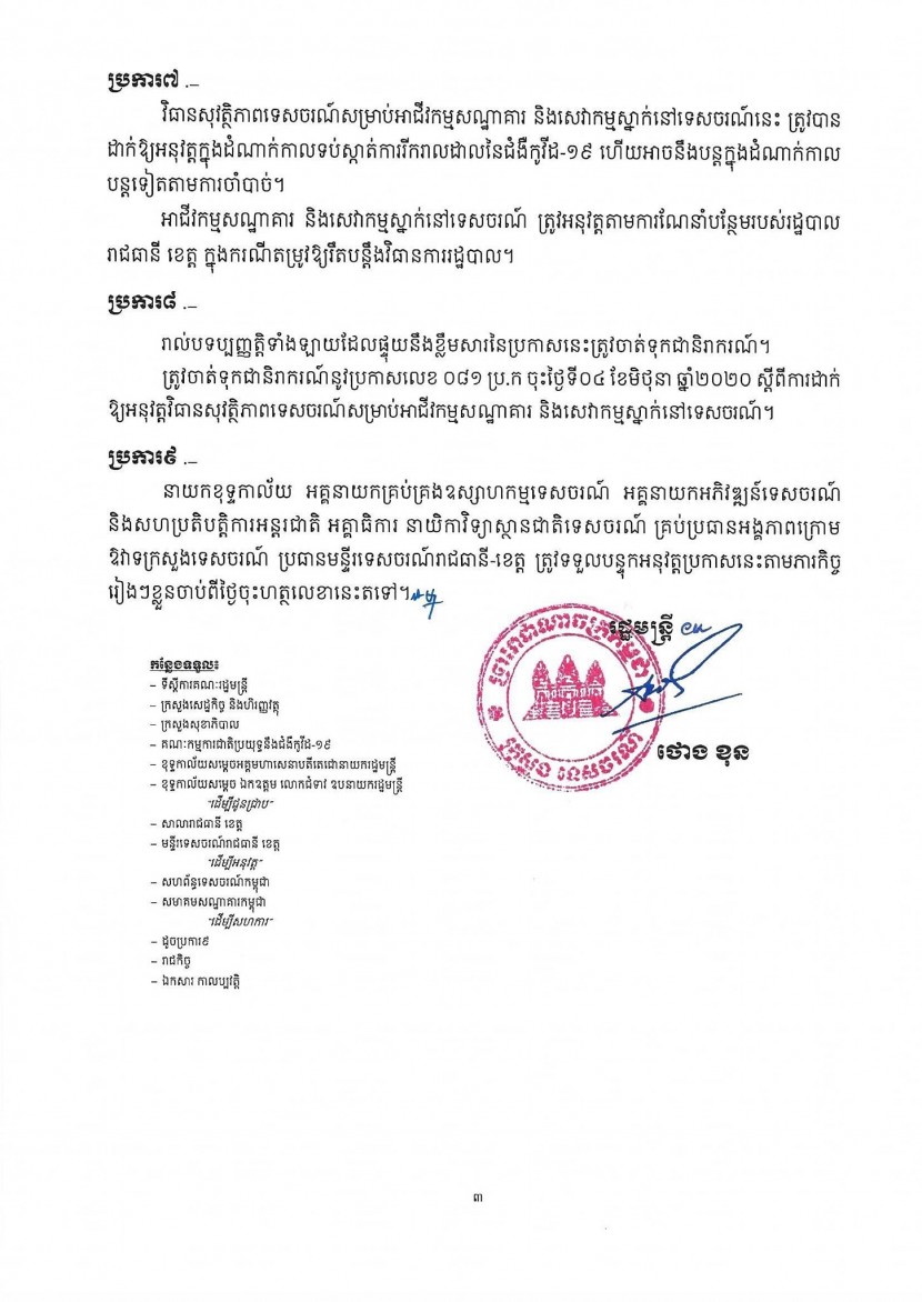 (ភ្នំពេញ)៖ ក្រសួងទេសចរណ៍ បានប្រកាសដាក់ឱ្យអនុវត្ត «ការធ្វើបច្ចុប្បន្នភាពការអនុវត្តវិធានសុវត្ថិភាពទេសចរណ៍ សម្រាប់សេវាកម្មស្នាក់នៅទេសចរណ៍» ដើម្បីចូលរួមទប់ស្កាត់ការរីករាលដាលនៃជំងឺកូវីដ-១៩ និងដើម្បីឆ្លើយតបទៅនឹងគន្លងប្រក្រតីភាពថ្មីនៅក្នុងស្ថានភាពនាពេលបច្ចុប្បន្ន។