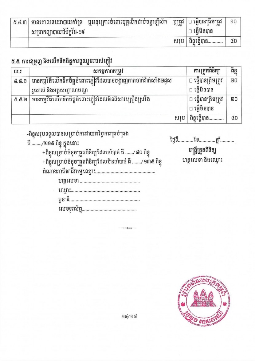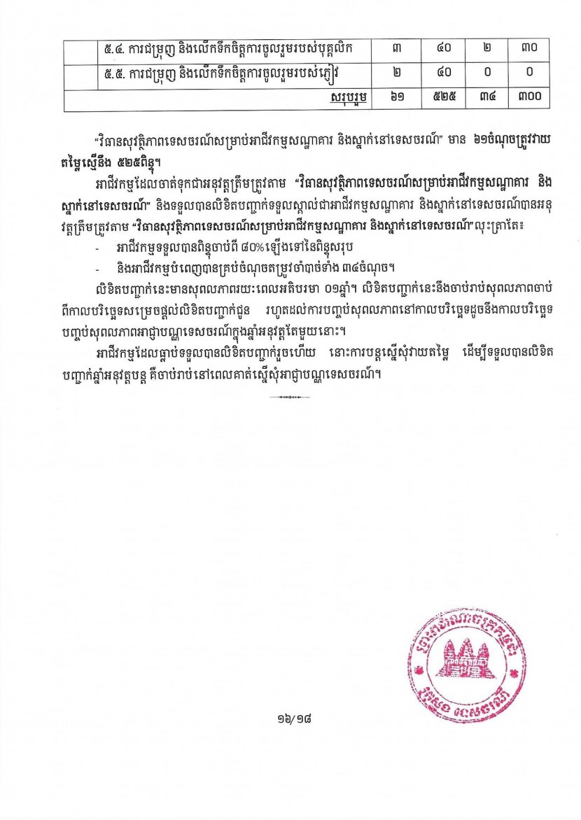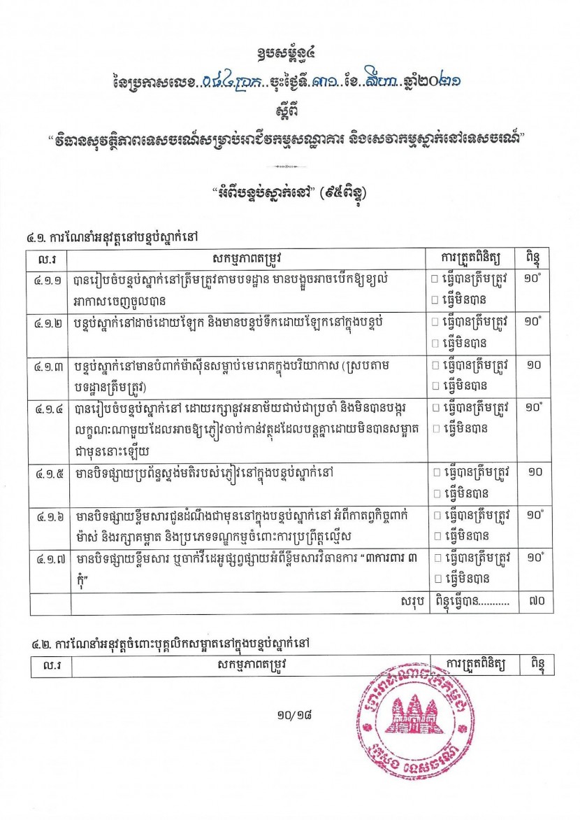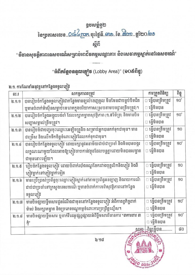 មន្រ្តីជាន់ខ្ពស់ក្រសួងទេសចរណ៍បានបន្តថា «ការធ្វើបច្ចុប្បន្នភាពការអនុវត្តវិធានសុវត្ថិភាពទេសចរណ៍ សម្រាប់សេវាកម្មស្នាក់នៅទេសចរណ៍» ត្រូវបានដាក់ឱ្យអនុវត្តជាកាតព្វកិច្ច និងជាលក្ខណ្ឌបន្ថែមក្នុងការស្នើសុំថ្មី ឬបន្តអាជ្ញាបណ្ណទេសចរណ៍ ដោយមាន ៦១ ចំណុច ត្រូវវាយតម្លៃស្មើនឹង ៥២៥ ពិន្ទុ ក្នុងនោះពិន្ទុចាំបាច់មាន ៣៤ ចំណុច។