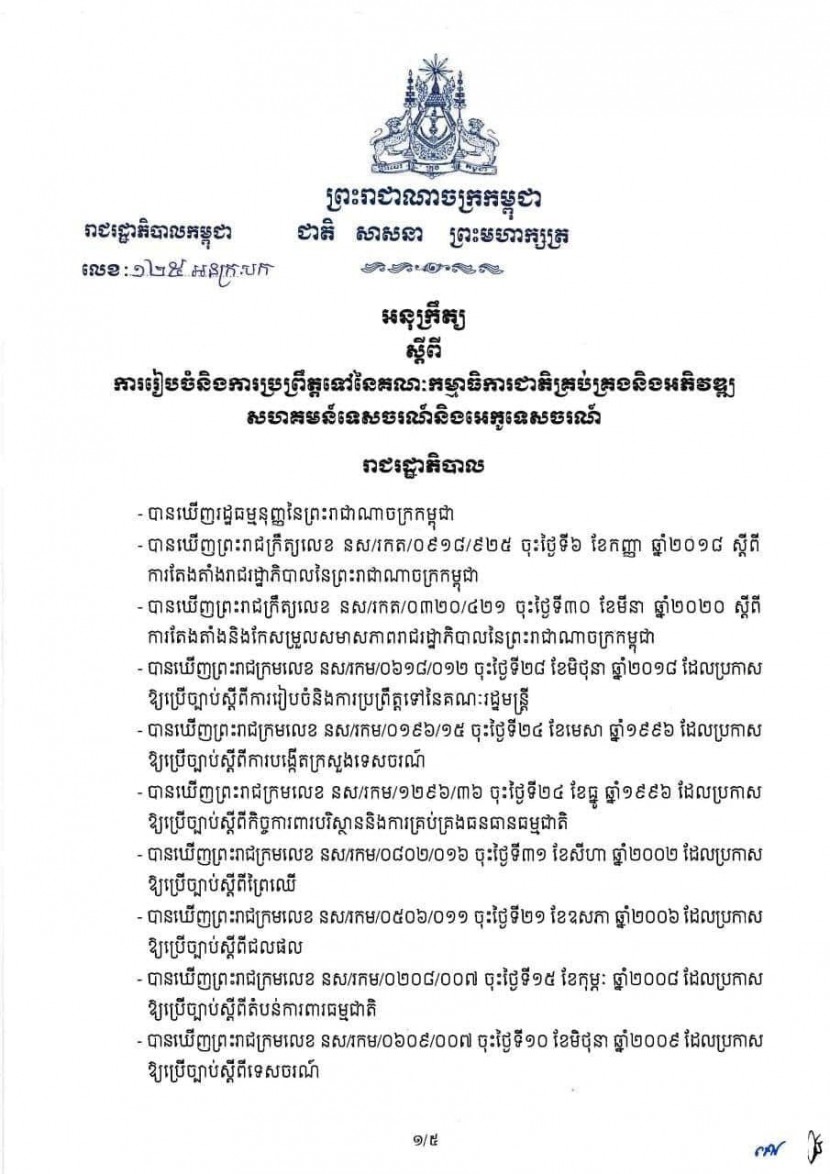 តាមរយៈអនុក្រឹត្យលេខ ១២៥ អនក្រ.បក ចុះថ្ងៃទី៣០ ខែកក្កដា ឆ្នាំ២០២១ ដោយមានឯកឧត្តមរដ្ឋមន្រ្តីក្រសួងទេសចរណ៍ ជាប្រធាន ឯកឧត្តមរដ្ឋមន្រ្តីក្រសួងបរិស្ថាន ជាអនុប្រធានអចិន្រ្តៃយ៍ និងឯកឧត្តមរដ្ឋមន្រ្តីក្រសួងកសិកម្ម ជាអនុប្រធាន និងតំណាងក្រសួងស្ថាប័នពាក់ព័ន្ធ រួមជាមួយគណៈអភិបាលខេត្ត ជាសមាជិក។