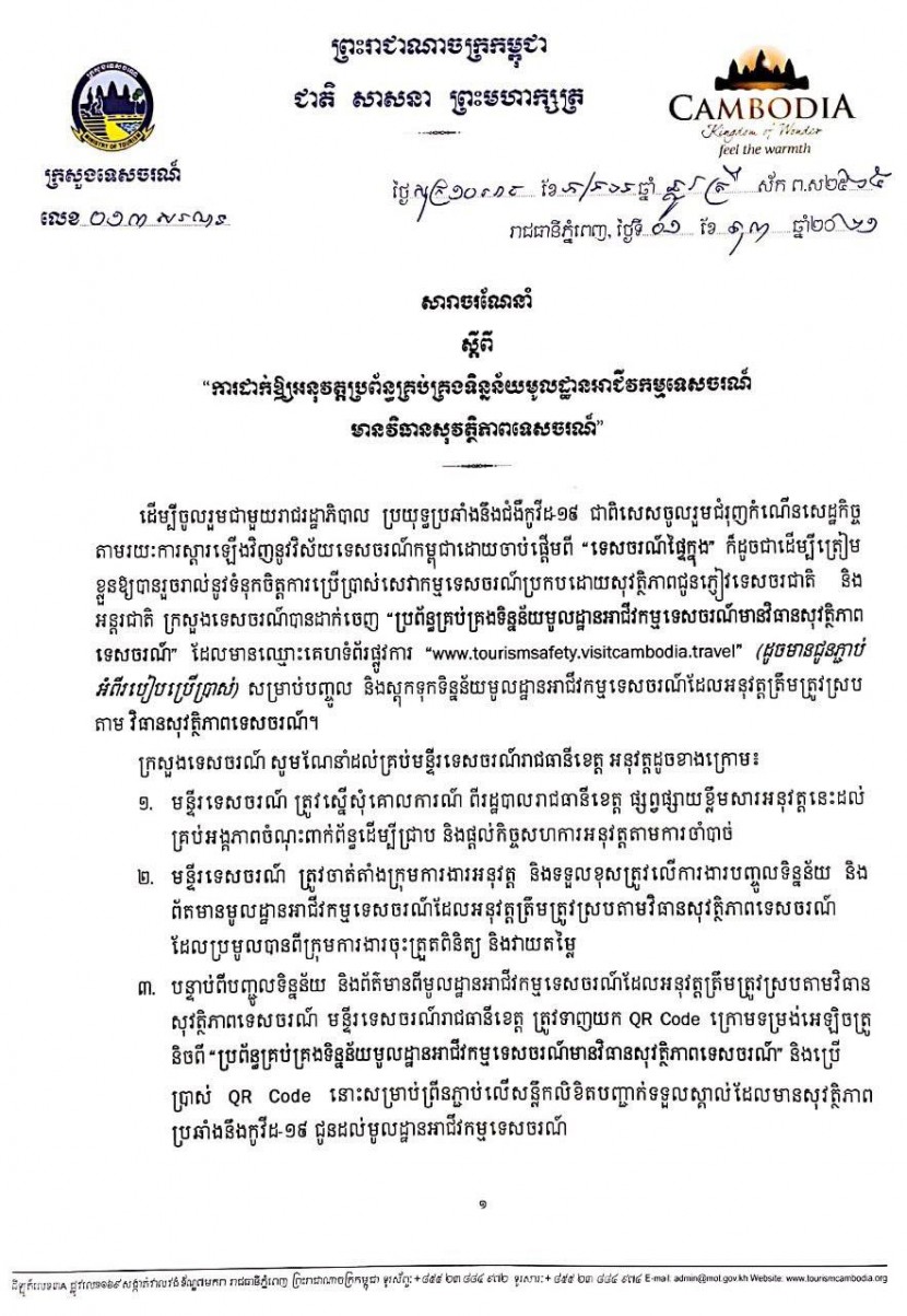 ក្រសួងទេសចរណ៍បានបង្កើតកម្មវិធីវគ្គបណ្តុះបណ្តាលតាមប្រព័ន្ធវីដេអូ ស្តីពី "ការបញ្ចូលទិន្នន័យមូលដ្ឋានអាជីវកម្មទេសចរណ៍ដែលមានវិធានសុវត្ថិភាពទេសចរណ៍នៅក្នុងប្រព័ន្ធអនឡាញ