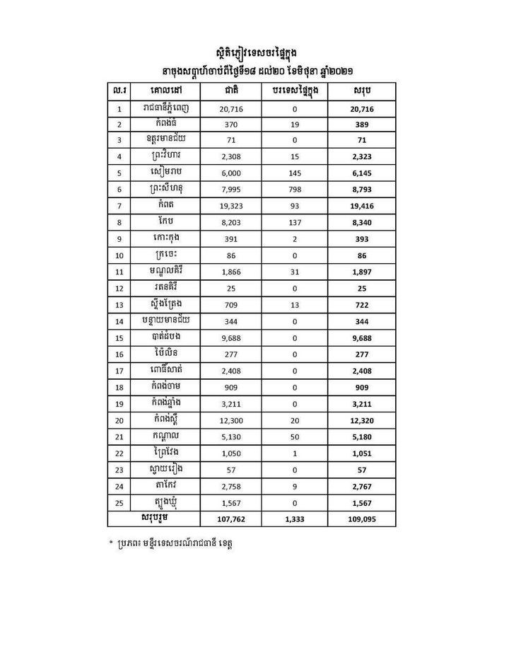 ឯកឧត្តមរដ្ឋមន្ត្រី ថោង ខុន បានឱ្យដឹងយ៉ាងដូច្នេះថា «នៅថ្ងៃទី១៨-២០ ខែមិថុនា ឆ្នាំ២០២១ ដែលជាថ្ងៃចុងសប្ដាហ៍ទីបីនៃខែមិថុនានោះ កម្ពុជាទទួលបានភ្ញៀវទេសចរសរុប ១០៩,០៩៥ នាក់ ក្នុងនោះភ្ញៀវជាតិមានចំនួន ១០៧,៧៦២ នាក់ និងភ្ញៀវបរទេសផ្ទៃក្នុងមានចំនួន ១,៣៣៣ នាក់ ក្នុងនោះគោលដៅតំបន់ឆ្នេរ គោលដៅអេកូទេសចរណ៍ ទេសចរណ៍ផ្សងព្រេង និងរមណីយដ្ឋានឯកជនកែច្នៃបែបទេសចរណ៍ធម្មជាតិ គឺជាគោលដៅដ៏សំខាន់ដែលមានភ្ញៀវទៅលេងច្រើនជាងគេ»។