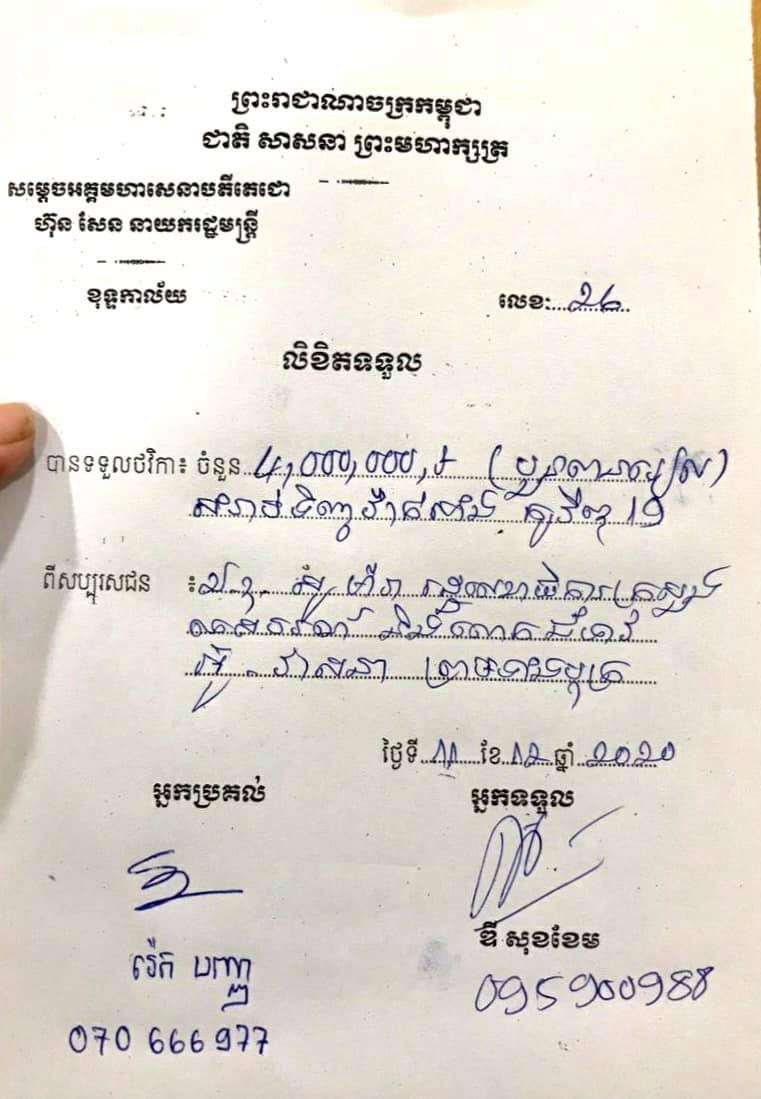 ឯកឧត្តម សូ ម៉ារ៉ា និងលោកជំទាវ បរិច្ចាគថវិកា៤លានរៀល ជូនសម្តេចតេជោ ហ៊ុន សែន ទិញវ៉ាក់សាំងកូវីដ-១៩