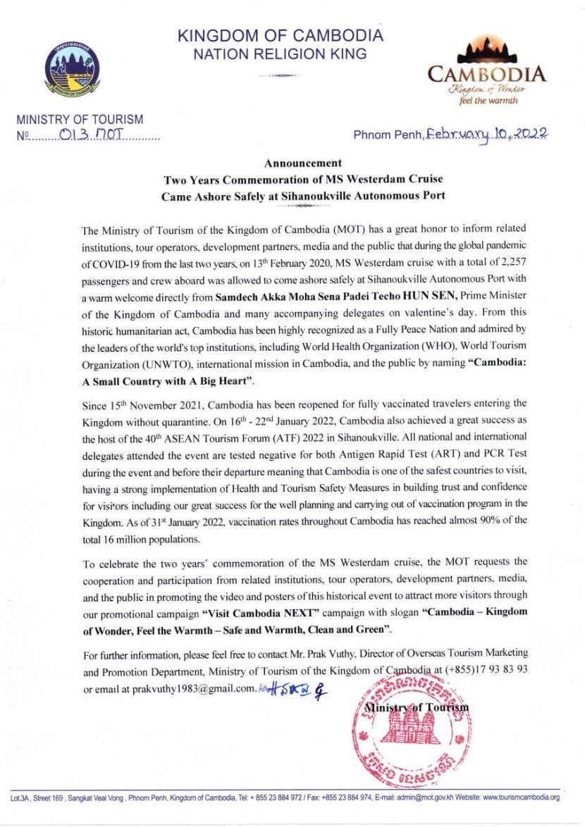 Cambodia - A Small Country with A Big Heart. This year, 13th February 2022, marks the Two Years Commemoration for MS Westerdam came ashore safely at Sihanoukville Autonomous Port, Cambodia on 13th February 2020 amid the global pandemic of COVID-19.