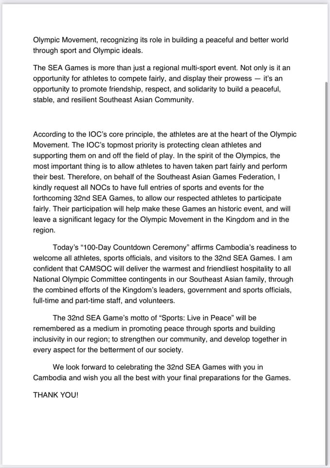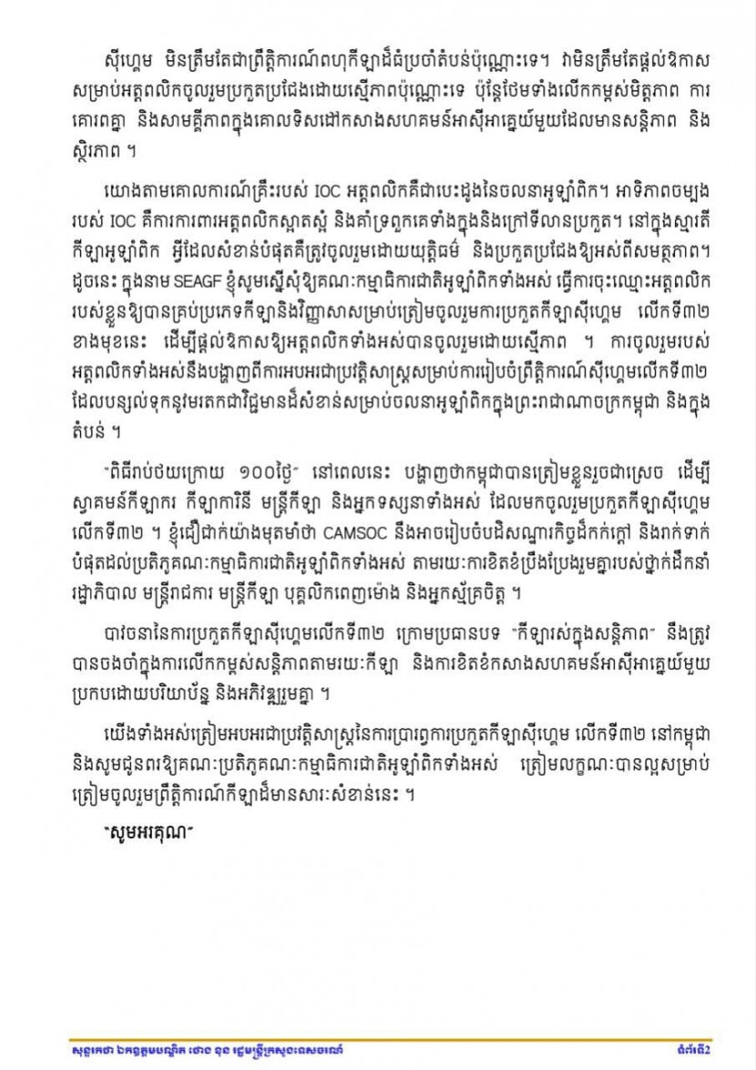 សុន្ទរកថា ឯកឧត្តម ថោង ខុន រដ្ឋមន្រ្តីក្រសួងទេសចរណ៍ ប្រធានគណៈកម្មាធិការជាតិអូឡាំពិកកម្ពុជា និងជាអនុប្រធានអចិន្រ្តៃយ៍គណៈកម្មាធិការជាតិ CAMSOC CAMAPGOC ក្នុងឱកាសនៃពិធី”រាប់ថយក្រោយ១០០ថ្ងៃ ឆ្ពោះទៅកាន់កីឡាសុីហ្គេម លេីកទី៣២” នៅពហុកីឡដ្ឋានជាតិមរតកតេជោ។