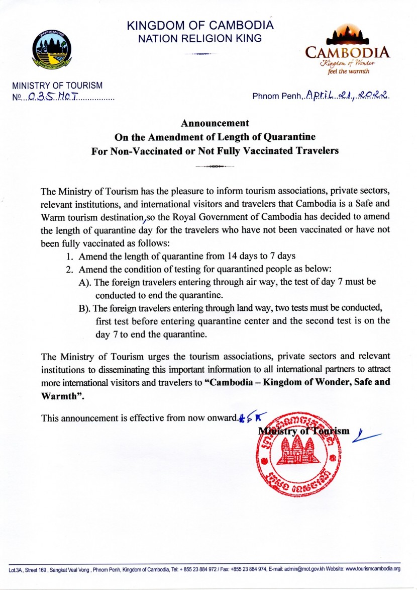 The Royal Government of Cambodia has decided to amend the length of quarantine day for the travelers who have not been vaccinated or have not been fully vaccinated as follows: