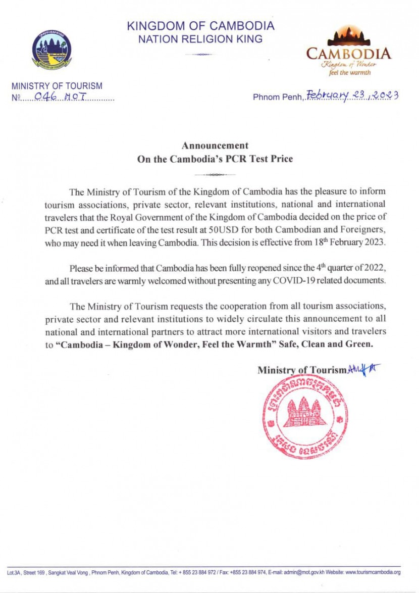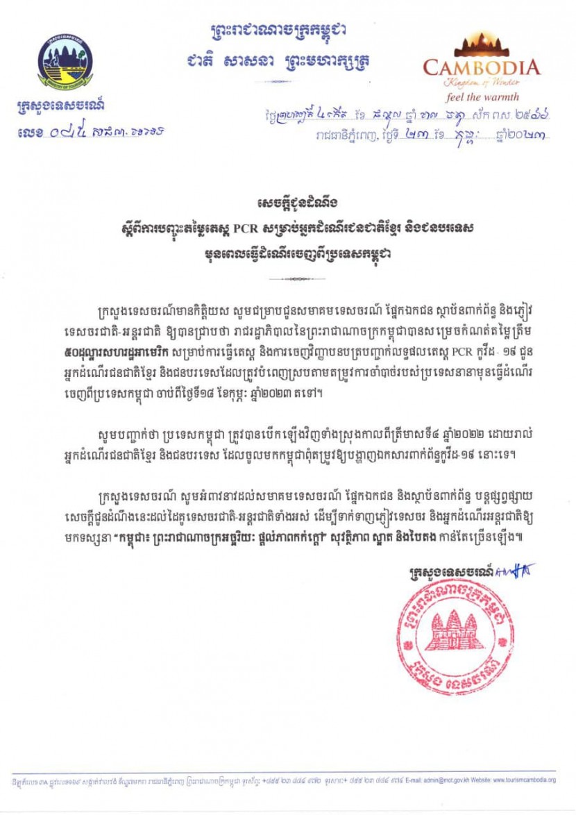 សេចក្ដីជូនដំណឹង ស្ដីពីការបញ្ចុះតម្លៃតេស្ត PCR សម្រាប់អ្នក ដំណេីរជនជាតិខ្មែរ និងជនបរទេស មុនពេលធ្វេីដំណេីរចេញពីប្រទេសកម្ពុជា