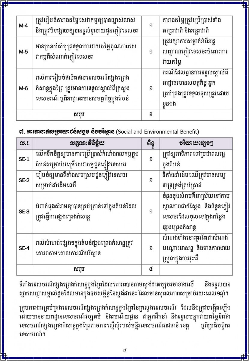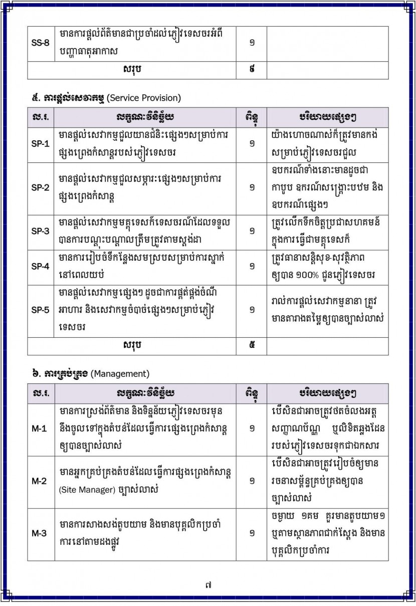គួរបញ្ជាក់ថា ស្តង់ដាទេសចរណ៍ផ្សងព្រេងនេះត្រូវបានបែងចែកជា ៧ សូចនាករ ដូចខាងក្រោម៖