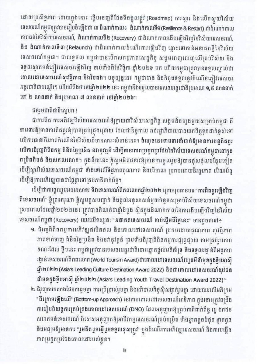 សារលិខិត សម្ដេចអគ្គមហាសេនាបតីតេជោ ហ៊ុន សែន នាយករដ្ឋមន្ត្រីនៃព្រះរាជាណាចក្រកម្ពុជា ក្នុងឱកាសអបអរសាទរទិវាទេសចរណ៍ពិភពលោកឆ្នាំ២០២២ ក្រោមប្រធានបទ ''ការគិតគូរឡើងវិញពីទេសចរណ៍'' (RETHINKING TOURISM)