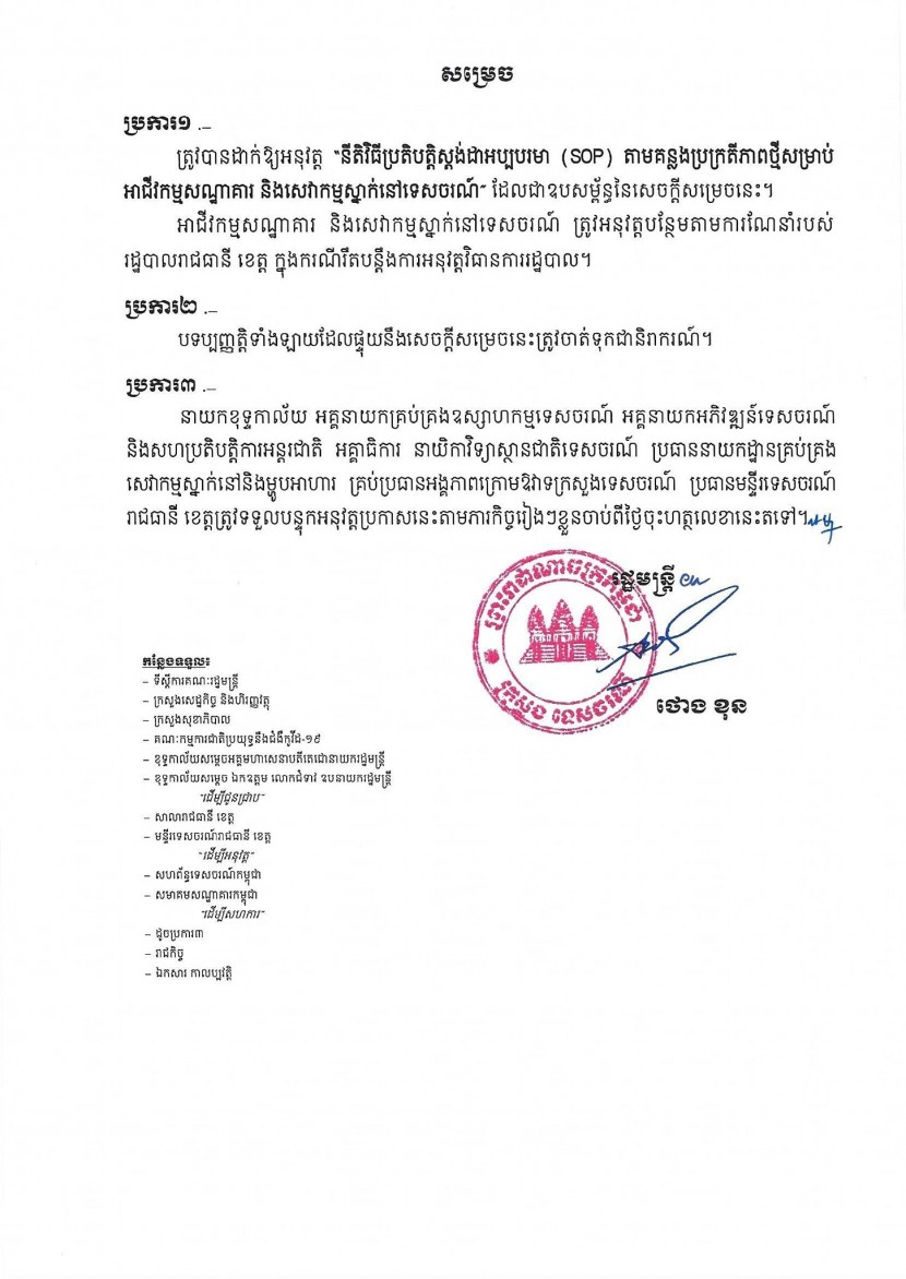 ក្រសួងទេសចរណ៍ ចេញសេចក្តីសម្រេចស្តីពី «ការដាក់ឱ្យអនុវត្តនីតិវិធីស្តង់ដាប្រតិបត្តិអប្បបរមា (SOP) តាមគន្លងប្រក្រតីភាពថ្មីសម្រាប់សេវាកម្មស្នាក់នៅទេសចរណ៍»