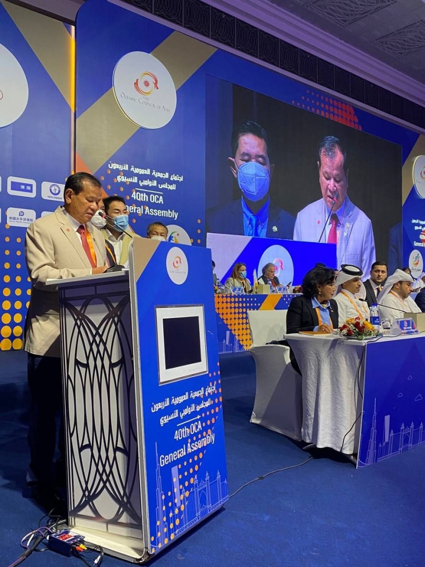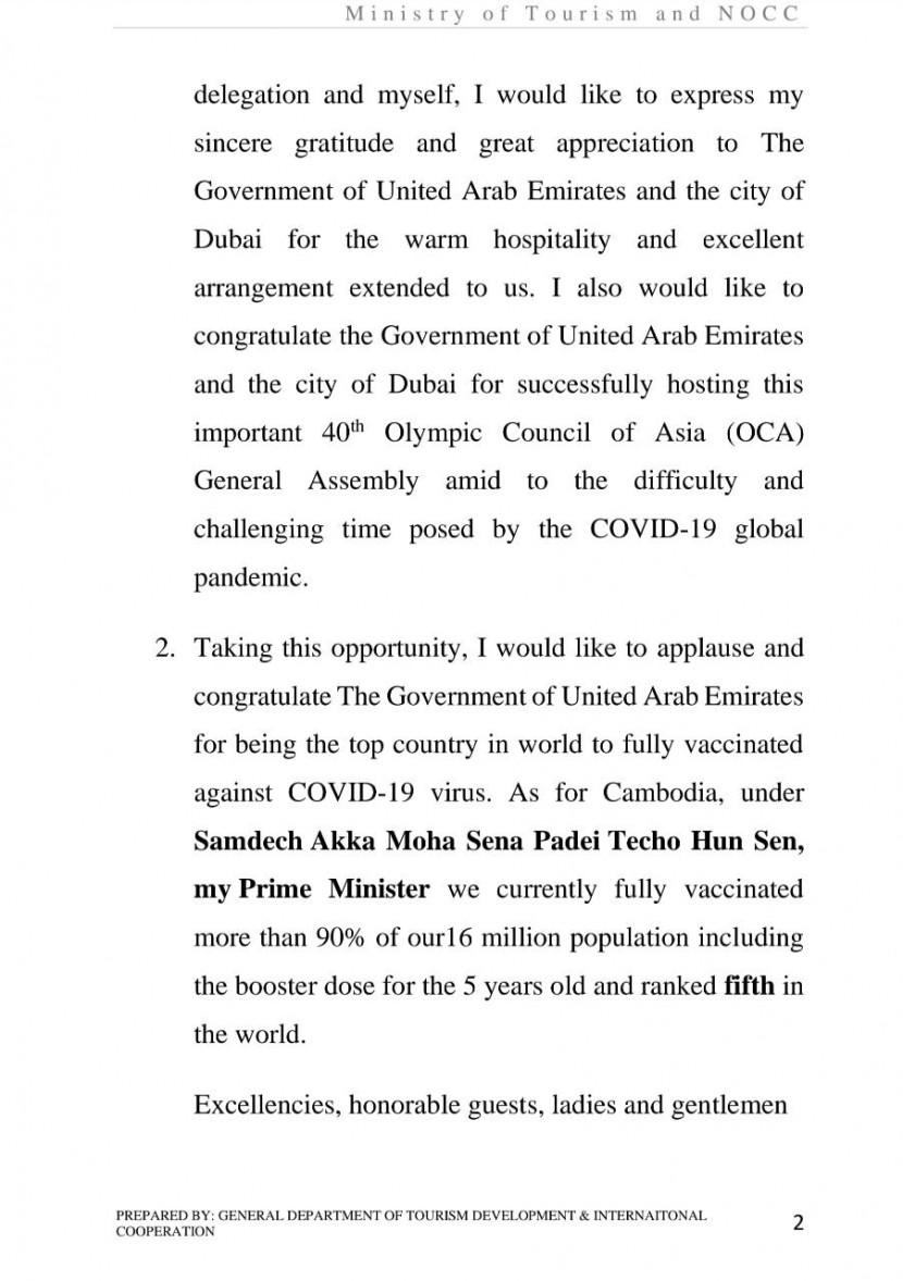 ឌូបៃ (អារ៉ាប់រួមអាមិរ៉រាត): នៅក្នងមហាសន្និបាត លើកទី ៤០ របស់ ក្រុមប្រឹក្សាអូឡាំពិក អាសុី OCA ដែលបានប្រព្រឹត្តិទៅនៅទីក្រុងឌូបៃ ប្រទេសអារ៉ាប់រួម នាព្រឹកថ្ងៃទី ២១-១១-២០២១ នេះ ដោយមានការចូលរួមពីប្រតិភូអូឡាំពិកមកពី៤៥ ប្រទេសនៃទ្វីបអាសុី ក្រោមអធិបតីភាព លោក Thomas Bach ប្រធានអូឡាំពិកអន្តរជាតិ IOC និង លោក Randhir Shing ប្រធានស្តីទីក្រមប្រឹក្សាអូឡាំពិកអាសុី ។ គណប្រតិភូកម្ពុជាដឹកនាំដោយ ឯកឧត្ដម ថោង ខុន រដ្ឋមន្ត្រី ទេសចរណ៍ និង ជាប្រធានគណកម្មាធិការជាតិអូឡាំពិកកម្ពុជា និងឯកឧត្ដម ឃួង ស្រេង អភិបាលរាជធានីភ្នំពេញ មានកិត្តយសត្រូវបាអនុញ្ញាតអោយឡើងថ្លែងសុន្ទរកថា ក្នុងនាមម្ចាស់ផ្ទះរៀបចំការប្រកួតកីឡាយុវជនអាសុី “AYG 2029 “ ។ បន្ទាប់ពីសុន្ទរកថារបស់ ឯកឧត្ដម ថោង ខុន កម្មវីធីចុះ