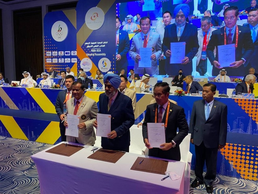 ហត្ថលេខាត្រូវបានចុះហត្ថលេខាធិការដោយ ឯកឧត្ដម ថោង ខុន ក្នុងនាមជាអ្នករៀបចំព្រិត្តិការណ៍និងឯកឧត្ដម ឃួង ស្រេង ក្នុងនាមទីក្រុងម្ចាស់ផ្ទះ ឯកឧត្ដម អ៊ុក សិទ្ធជាតិ ដំណាង ក្រសួង អប់រំយុវជនកីឡា ជាសាក្សី ជាមួយ លោក Randhir Shing ប្រធានស្តីទី ក្រុមប្រឹក្សាអូឡាំពិកអាសុី។ ពិធីចុះហត្ថលេខាបានប្រព្រិត្តិទៅ ក្រោមការអបអរសាទរយ៉ាងកក់ក្តៅពីថ្នាក់ដឹកនាំក្រុមប្រឹក្សាអូឡាំពិកអាសុី និងចលនាអូឡាំពិកអាសុីទាំង ៤៥ ប្រទេស ដែលបានចូលរួមក៏បានសម្តែងនូវការអបអរសាទរ និងកោតសរសេីរភាពសកម្មនៃការអភិវឌ្ឍ ចលនាកីឡាក្នុងតំបន់ និងទ្វិបអាសុីរបស់កម្ពុជា ។