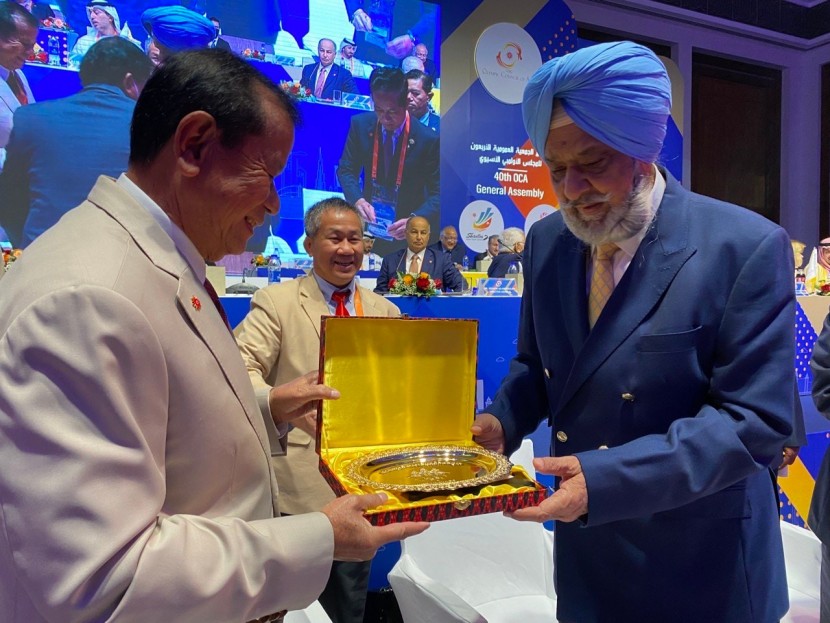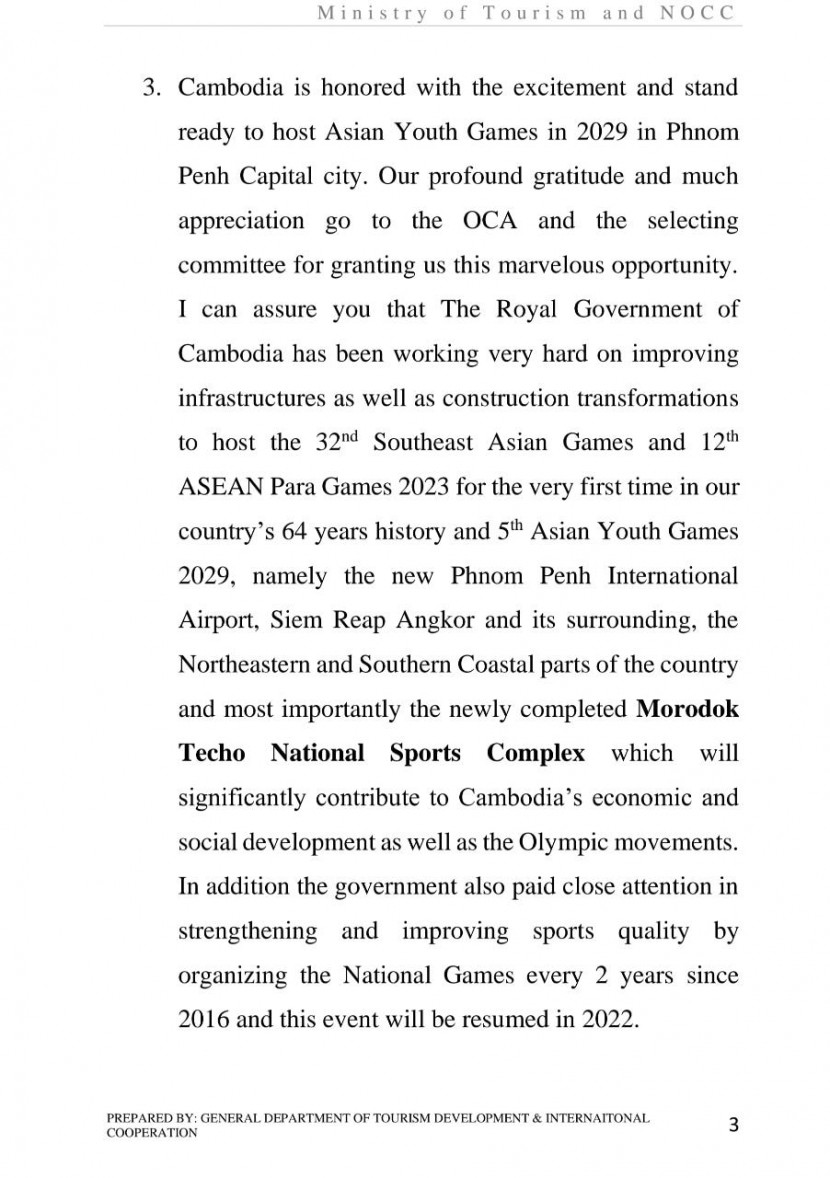 សូមជំរាបជូនថា ដោយបានទទួលការអនុញ្ញាត្តិដ៏ខ្ពង់ខ្ពស់ពីសម្តេចតេជោនាយករដ្ឋមន្ត្រី ប្រមុខរាជរដ្ឋាភិបាលកម្ពុជា ឯកឧត្ដម ថោង ខុន និង ឯកឧត្ដម ឃួងស្រេង បានដីកានាំប្រតិភូមួយរួមមាន ឯកឧត្ដមអគ្គនាយកកីឡា អ៊ុក សិទ្ធជាតិ ឯកឧត្ដម វ៉ាត់ចំរើន អគ្គលេខាធិការ NOCC ទៅចូលរូម មហាសន្និបាតក្រុប្រិក្សាកីឡាអាស៊ីលើកទី៤០ នៅទីក្រុង ឌូបៃ និងដើម្បីចុះហត្ថលេខា ដើម្បីទទួលសិទ្ធធ្វើជាម្ចាស់ផ្ទះ ព្រិត្តិការណ៍ កីឡា យុវជនអូឡាំពិកអាសុីលើកទី ៥ ឆ្នាំ២០២៩ នៅរាជធានីភ្នំពេញ។