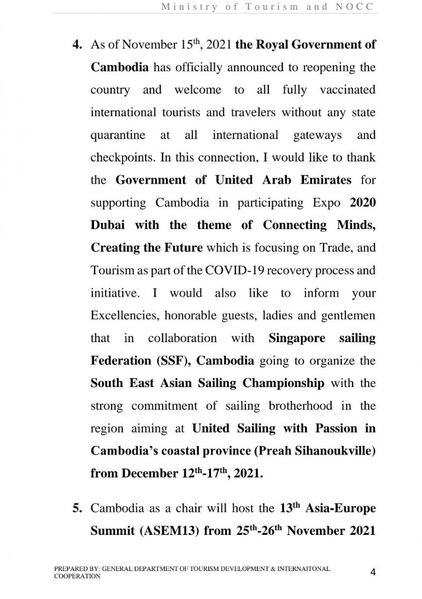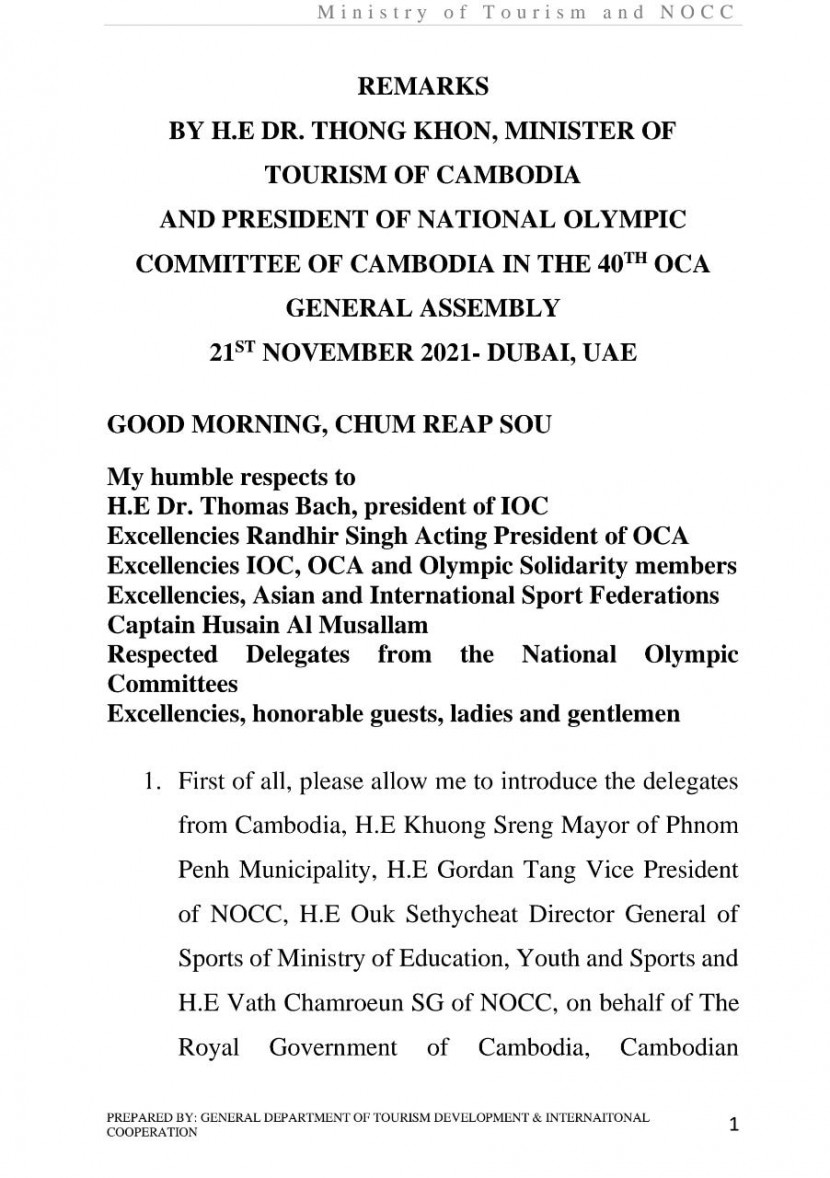 ខាងក្រោមនេះជាសន្ទរកថា ឯកឧត្ដម ថោង ខុន រដ្ឋមន្រ្តីក្រសួងទេសចរណ៍ និង ជាប្រធានគណកម្មាធិការជាតិអូឡាំពិកកម្ពុជា៖