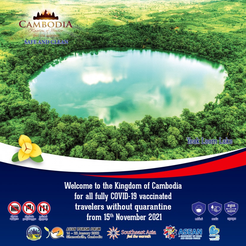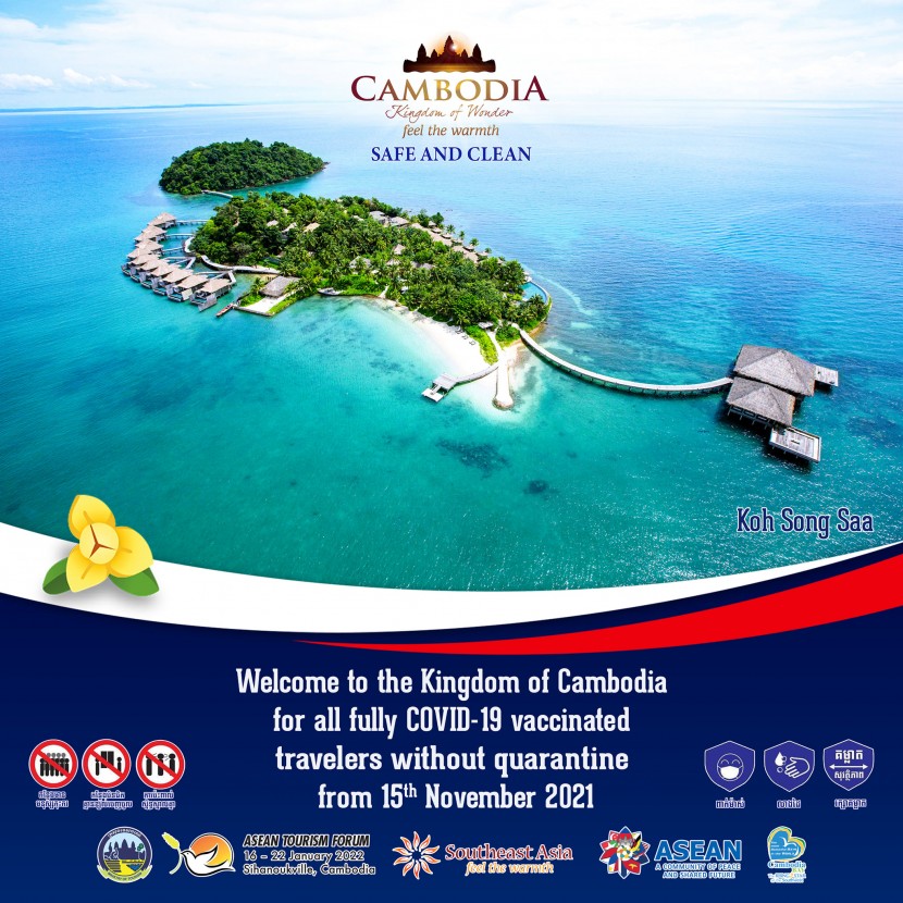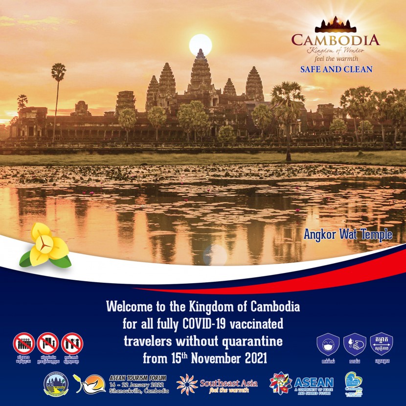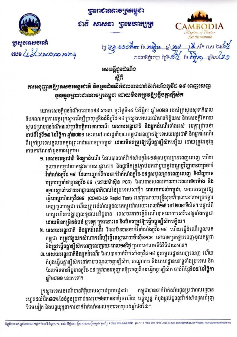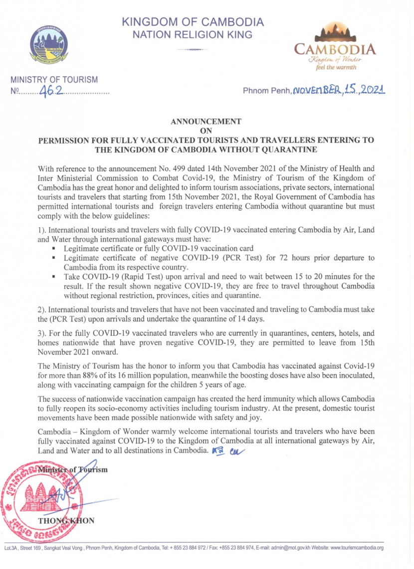 The Announcement of the Ministry of Tourism of the Kingdom Cambodia on the permission for fully vaccinated tourists and travellers entering the Kingdom of Cambodia without quarantine from 15th November 2021.