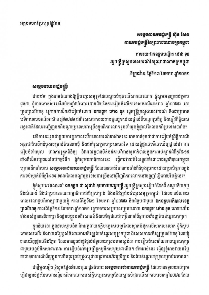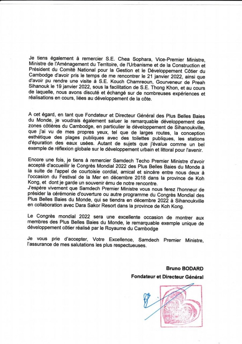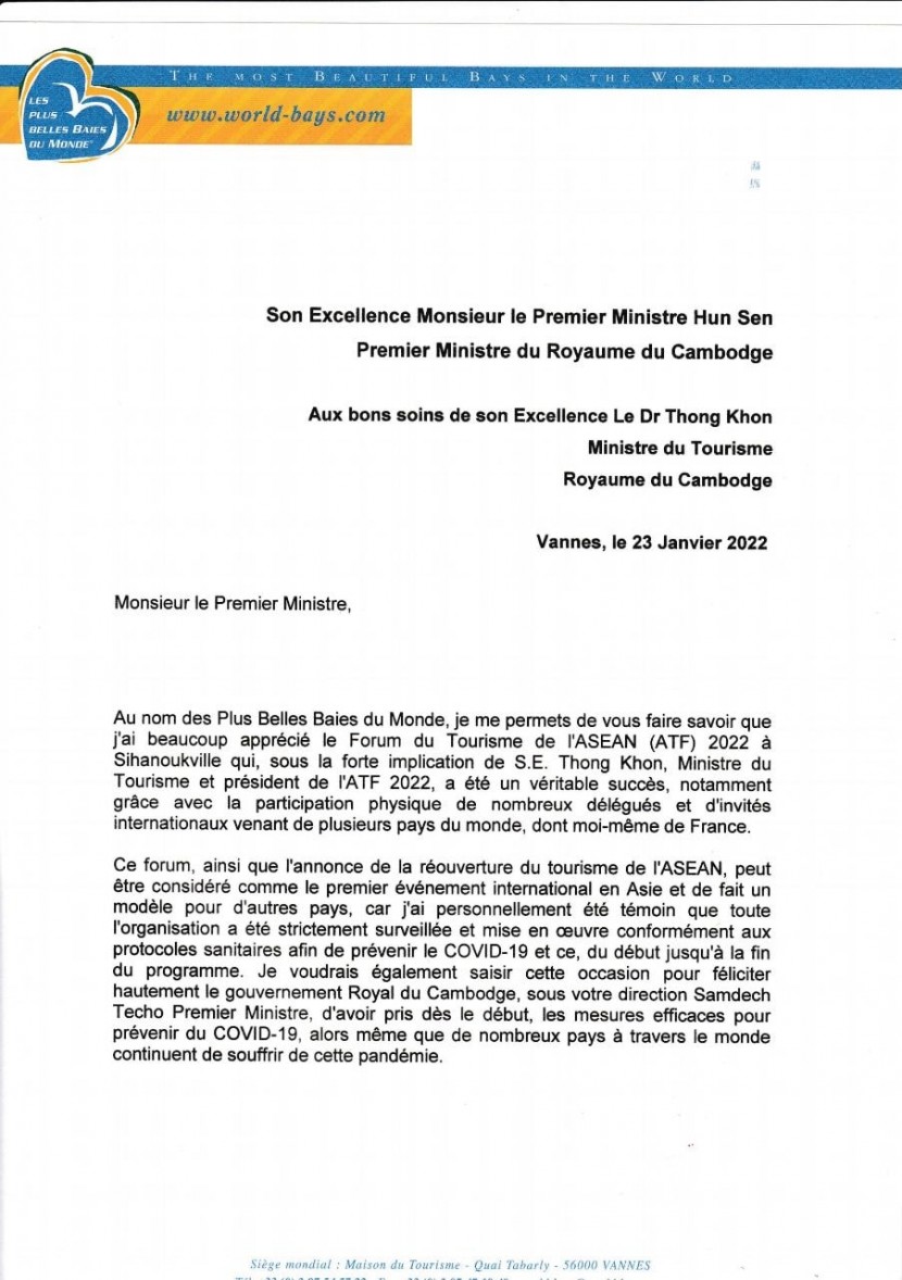 លិខិតអបអរសាទរ និងថ្លែងអំណរគុណពីតំណាងក្លឹបឆ្នេរសមុទ្រដែលស្អាតបំផុតលើសកលលោក (the Most Beautiful Bays in the World) ជូនចំពោះរាជរដ្ឋាភិបាលកម្ពុជា ក្នុងការរៀបចំវេទិការទេសចរណ៍អាស៊ានលើកទី៤០ ឆ្នាំ២០២២ នៅក្រុងព្រះសីហនុ ខេត្តព្រះសីហនុ