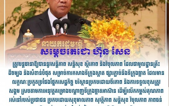 ការលើកឡើងបែបនេះរបស់សម្តេច ធ្វើឡើងក្នុងឱកាសដែលសម្តេចតេជោ ហ៊ុន សែន អញ្ជើញជាអធិបតីប្រារព្ធពិធីអបអរសាទរ ទិវាជាតិទីក្រុងស្អាតលើកទី១១ ដែលប្រារព្ធធ្វើឡើងនៅសណ្ឋាគារសុខា រាជធានីភ្...